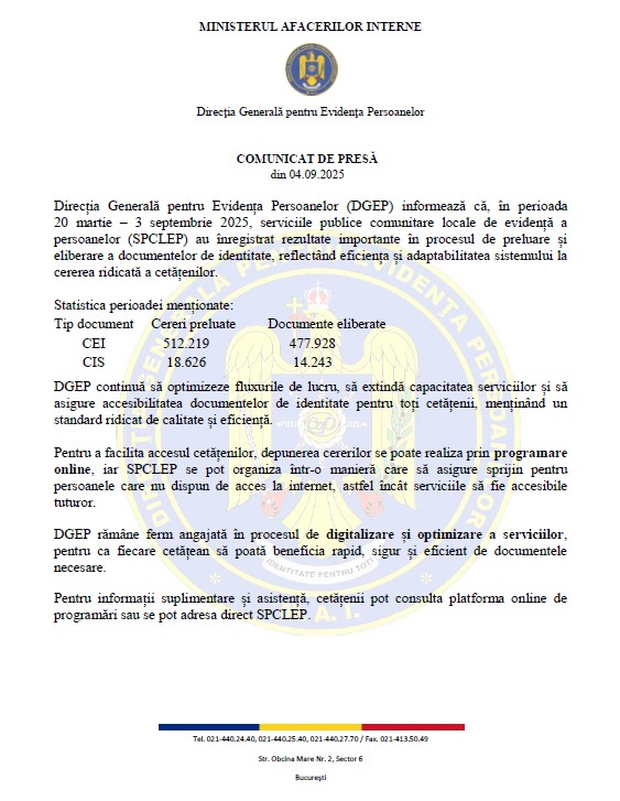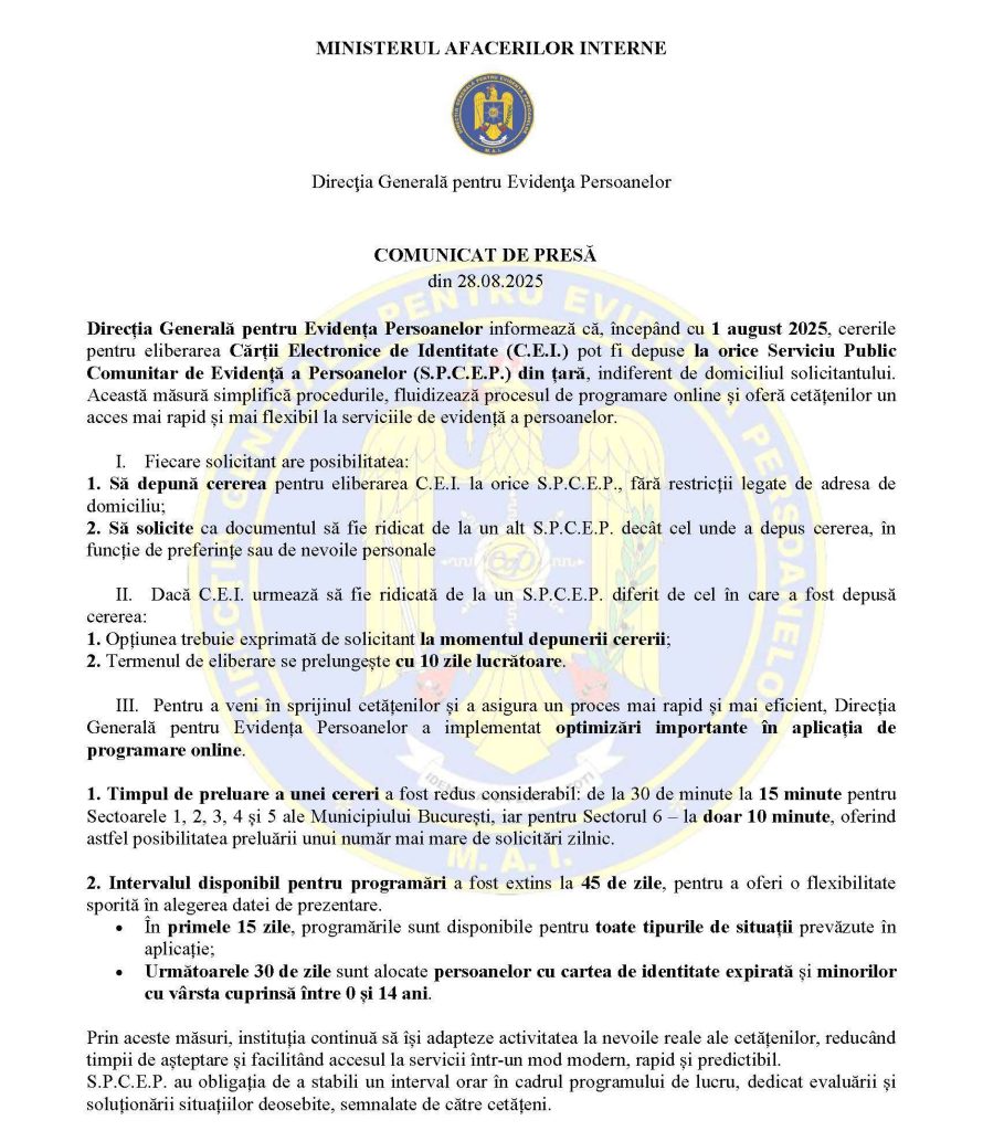 Începând cu 1 august 2025, cetățenii pot solicita Cartea Electronică de Identitate (CEI) la orice serviciu public comunitar de evidență a persoanelor, indiferent de localitatea în care își au domiciliul.